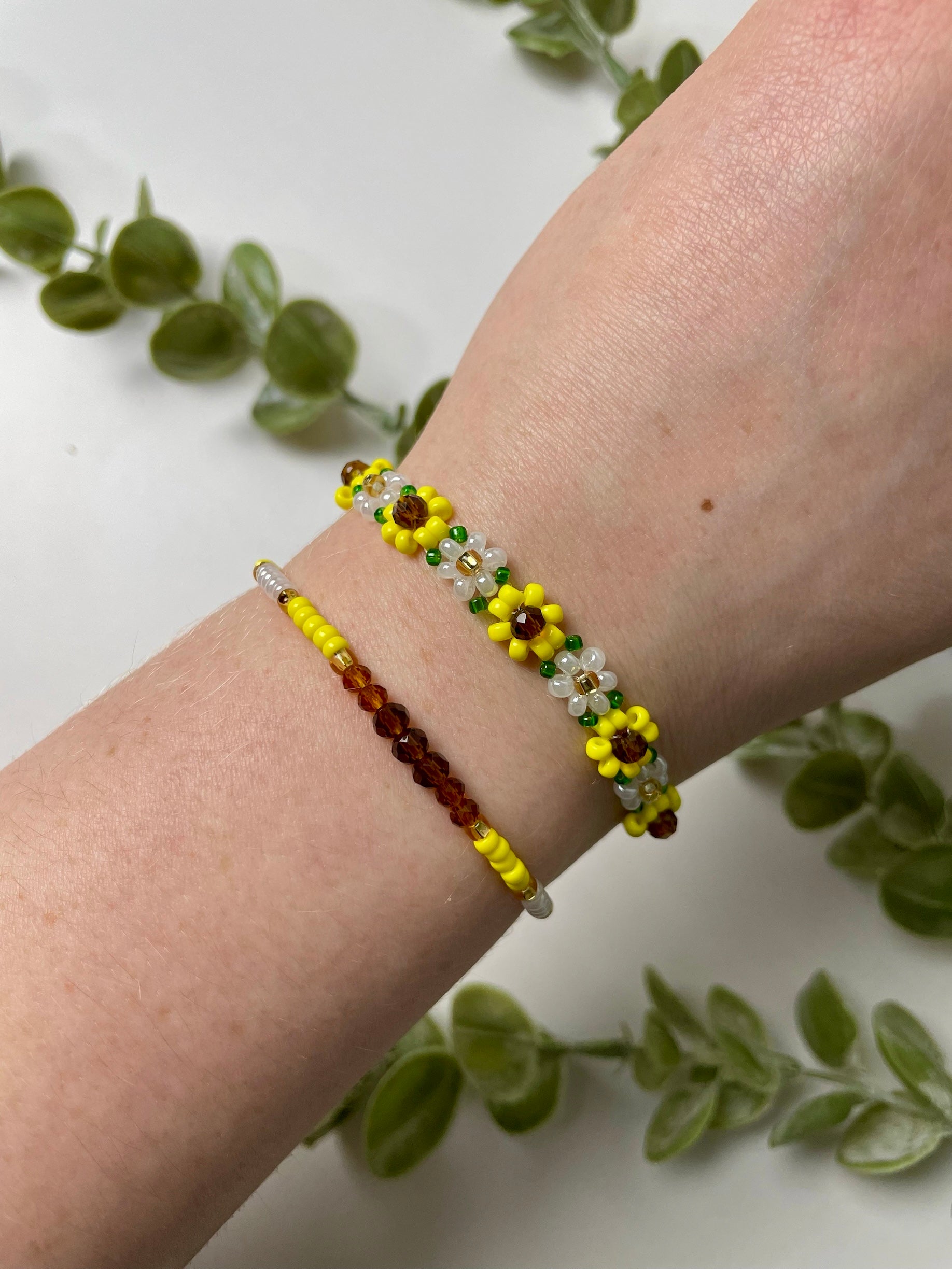 Add a touch of sunlight to your look with this gorgeous handmade bracelet set! Whether you are dressing up for a sunny day or just want to carry a little floral charm on your wrist, these bracelets are sure to bring smiles. They also make a lovely gift for anyone special to you.