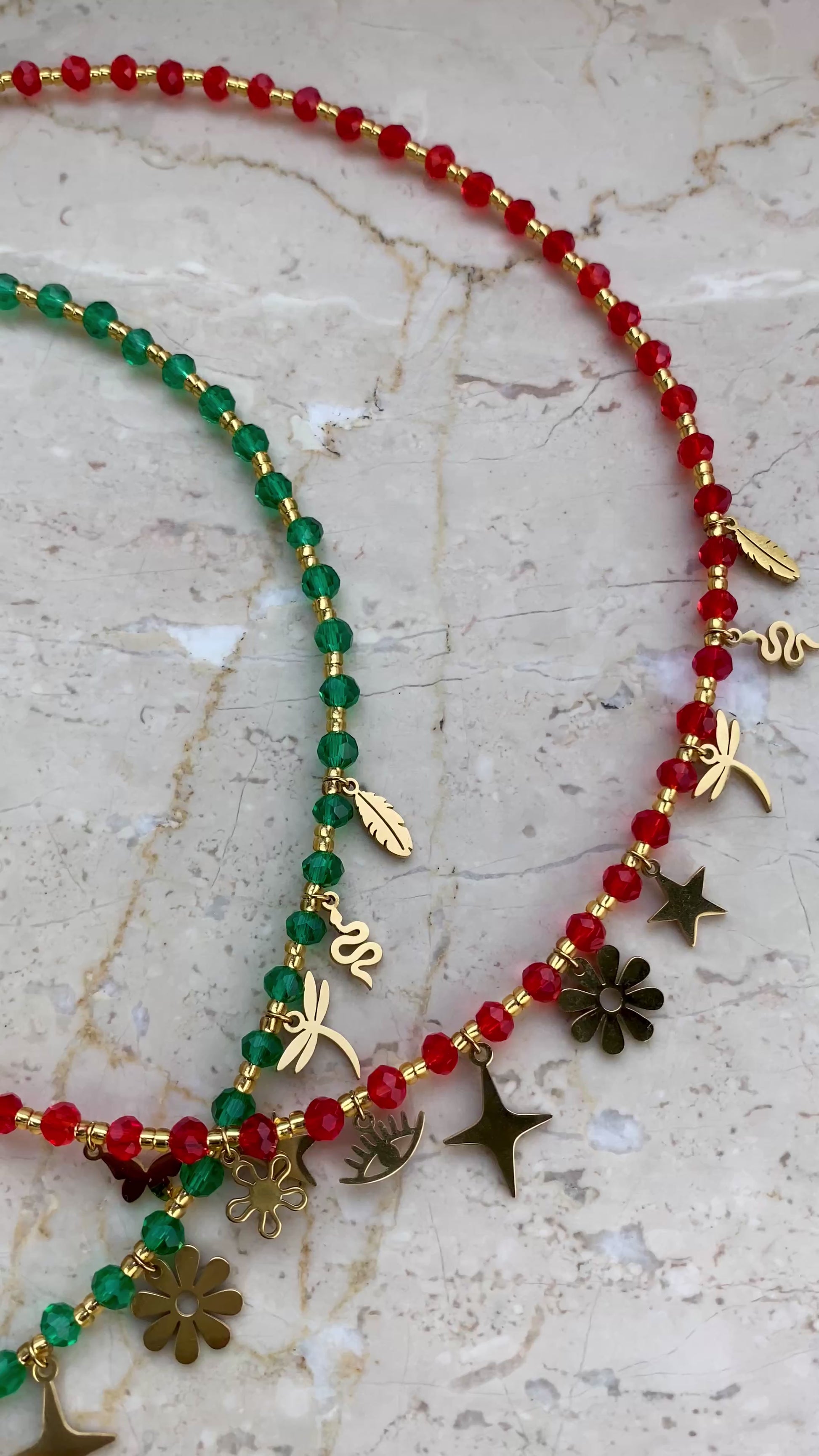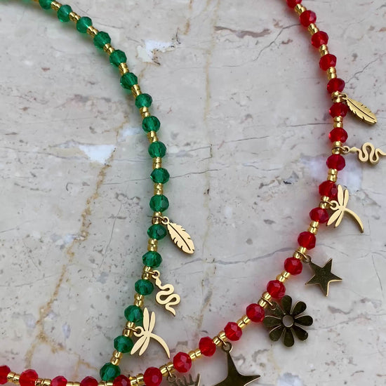 Elevate your holiday style with this stunning Christmas Charm Necklace, designed with a luxurious mix of meaningful charms. Featuring the butterfly, daisy, evil eye, four-point star, eight-petal flower, five-point star, dragonfly, snake, leaf, and little girl charm, this necklace brings together symbols of transformation, joy, protection, renewal and the pure magic of Christmas. Available in green and red, it adds a festive sparkle to any outfit and makes a heartfelt, unforgettable gift for the season.